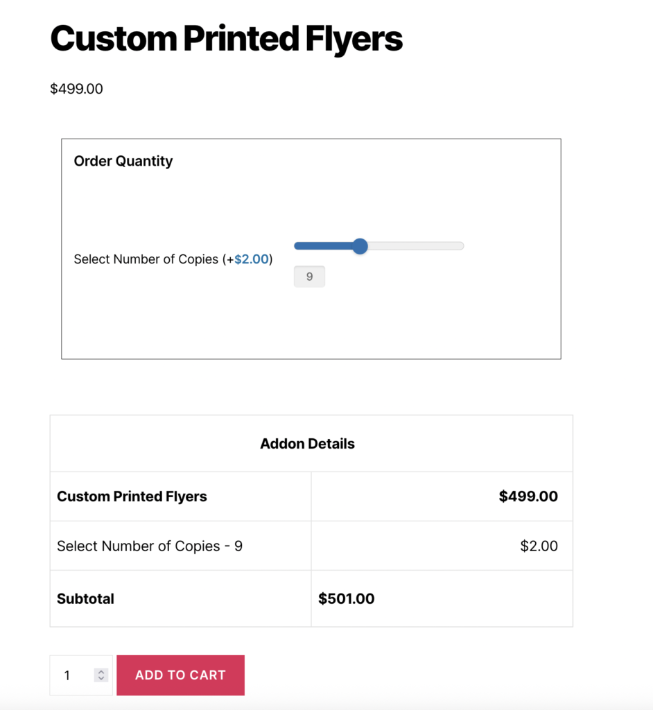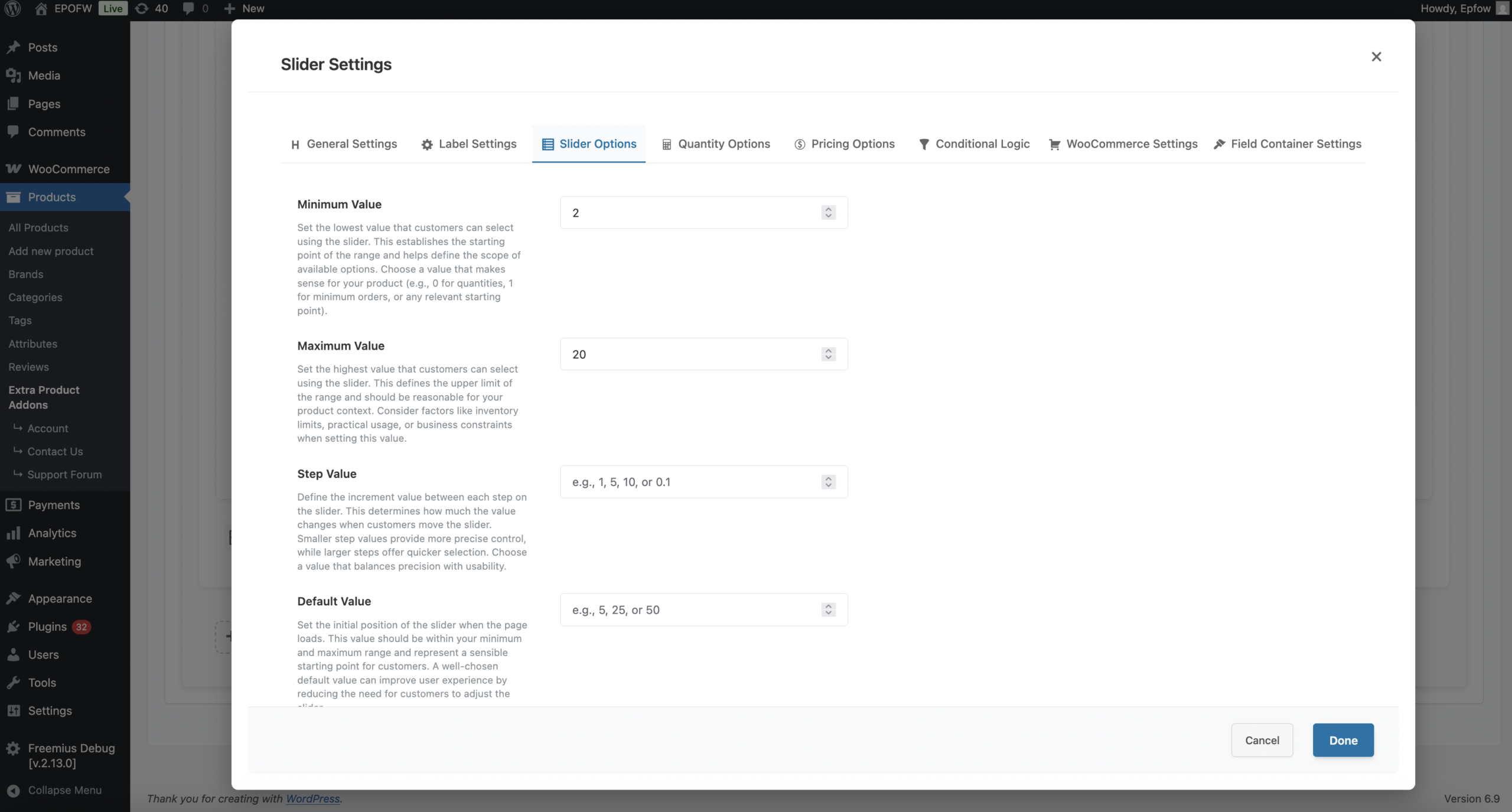 Unlike standard WooCommerce product fields, Extra Product Options for WooCommerce’s Slider Field includes advanced features that give you complete control over customer selections: