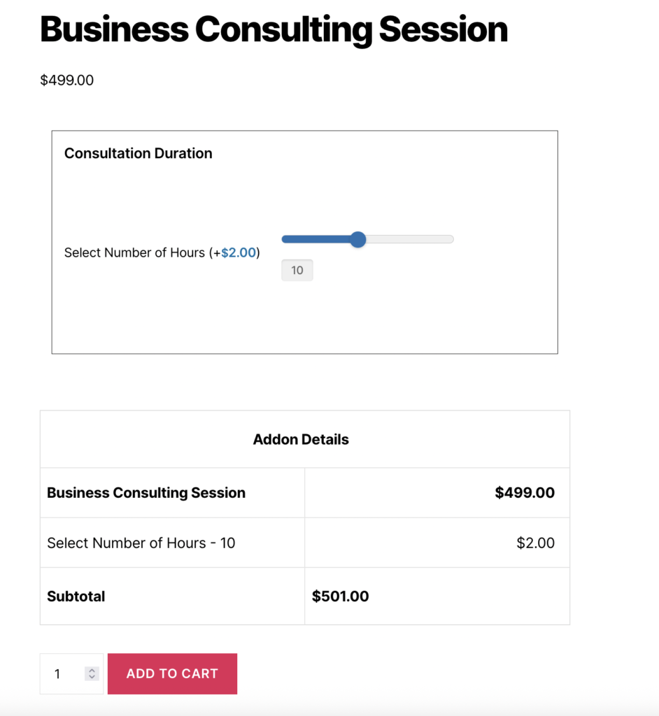 Consultation Hours: Ideal for service-based businesses where customers book consultation time. Customers can slide to select the number of hours they need, with pricing that scales automatically.