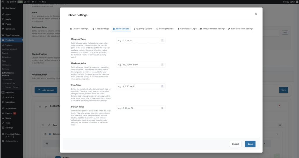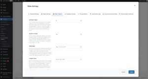 - Configure your settings including min/max values, step increment, and default value in Slider Options Tab