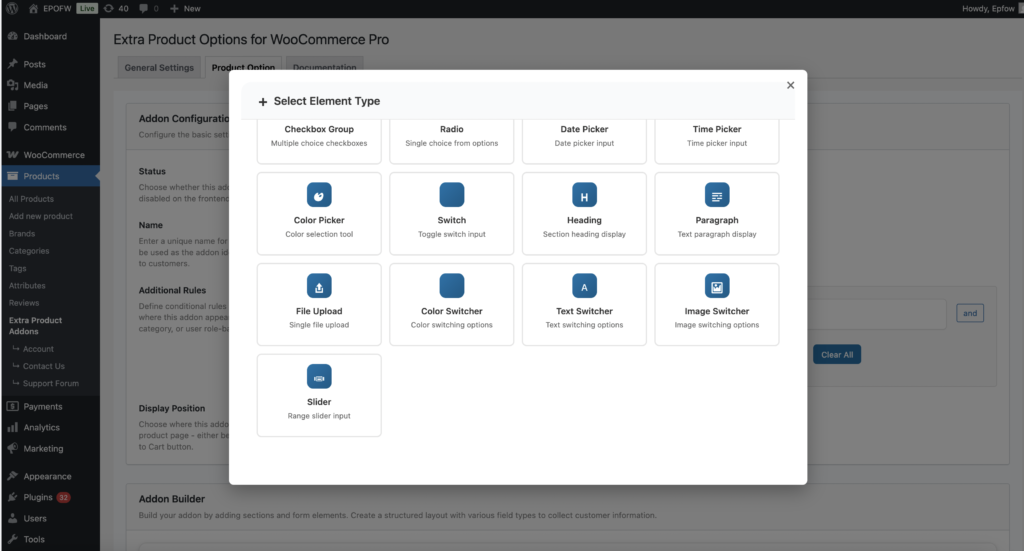 - Navigate to the Products – Extra Product Addons – Product Option – Addon Builder