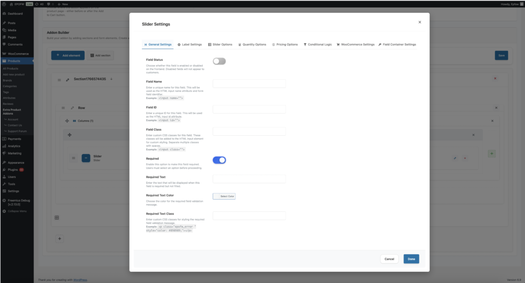 The Slider Field provides one of the most intuitive and interactive ways for customers to enter numeric values on your WooCommerce product pages. It improves the shopping experience through smooth controls, visual clarity, and instant price updates. With support for fixed pricing, percentage pricing, step-based pricing, and advanced custom formulas, the Slider Field is ideal for products that require measurement-based or quantity-based adjustments.