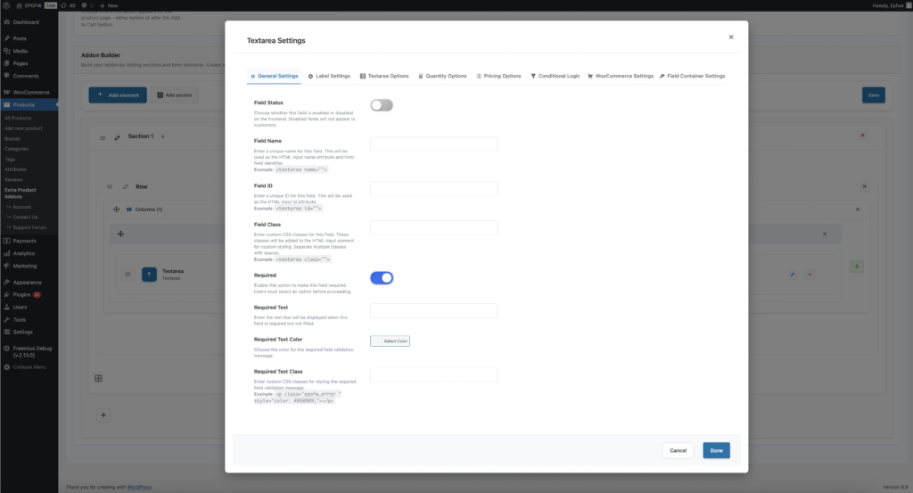 Follow these comprehensive step-by-step instructions to add a Textarea Field to your WooCommerce products. This guide covers all essential settings organized into General Settings, Label Settings, and Textarea Options.