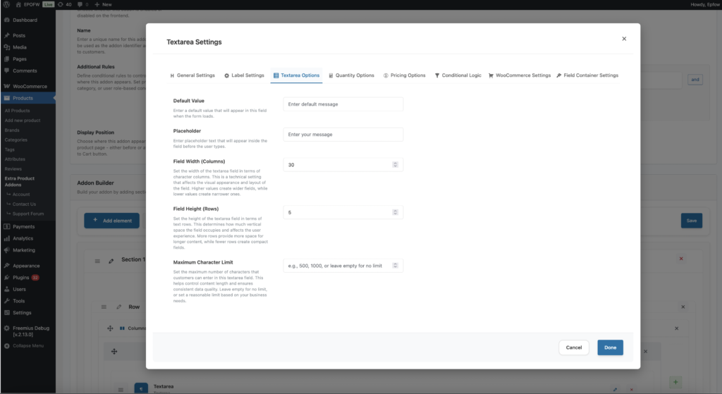 The Textarea Field is one of the most versatile options in the Extra Product Options for WooCommerce plugin suite. It bridges the gap between brief text entries and full document uploads, enabling store owners to collect detailed information without requiring file uploads.