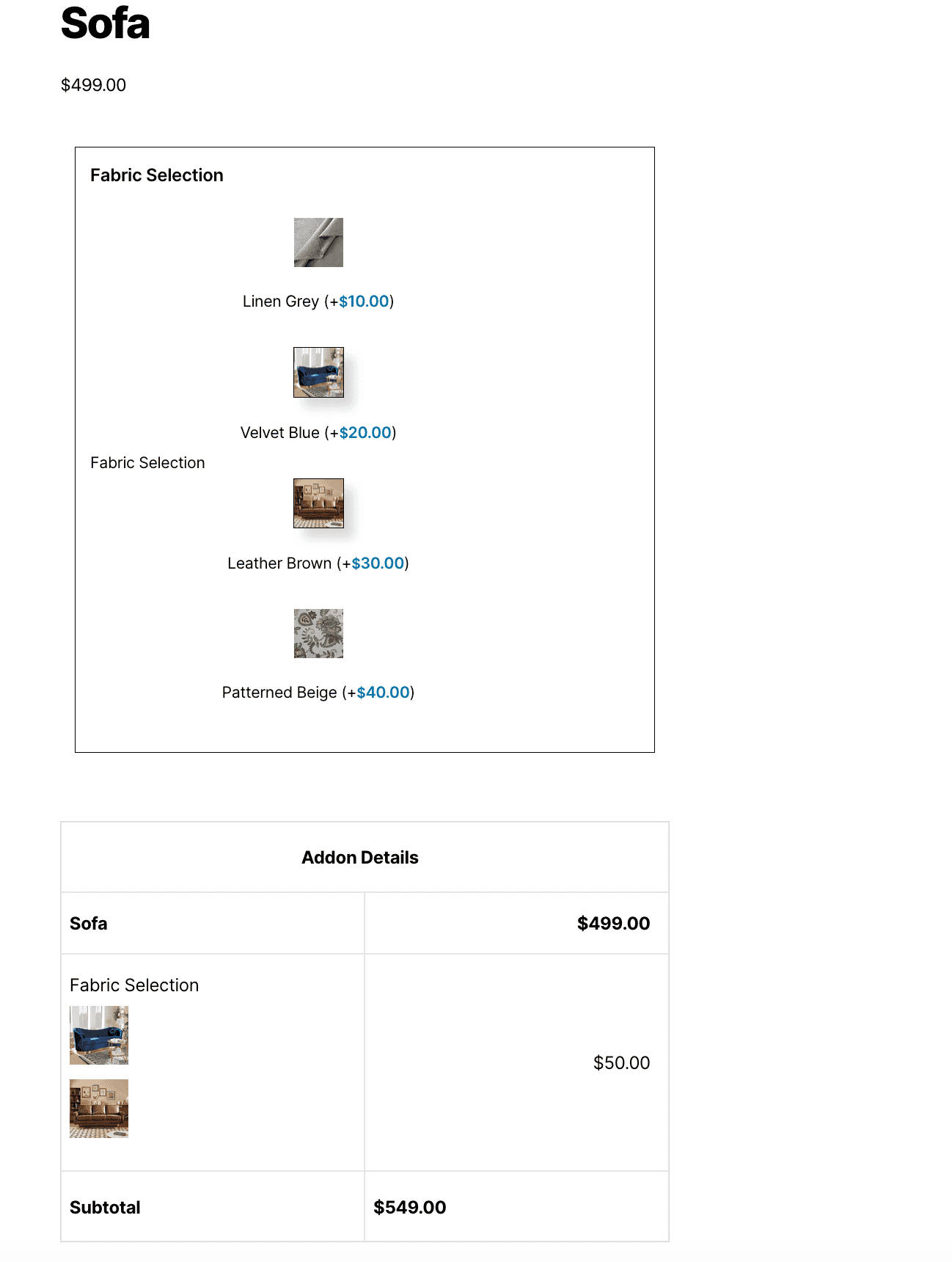 Unlike standard WooCommerce product fields, Extra Product Options for WooCommerce’s Image Switcher Field includes advanced features that give you complete control over visual selection and pricing: