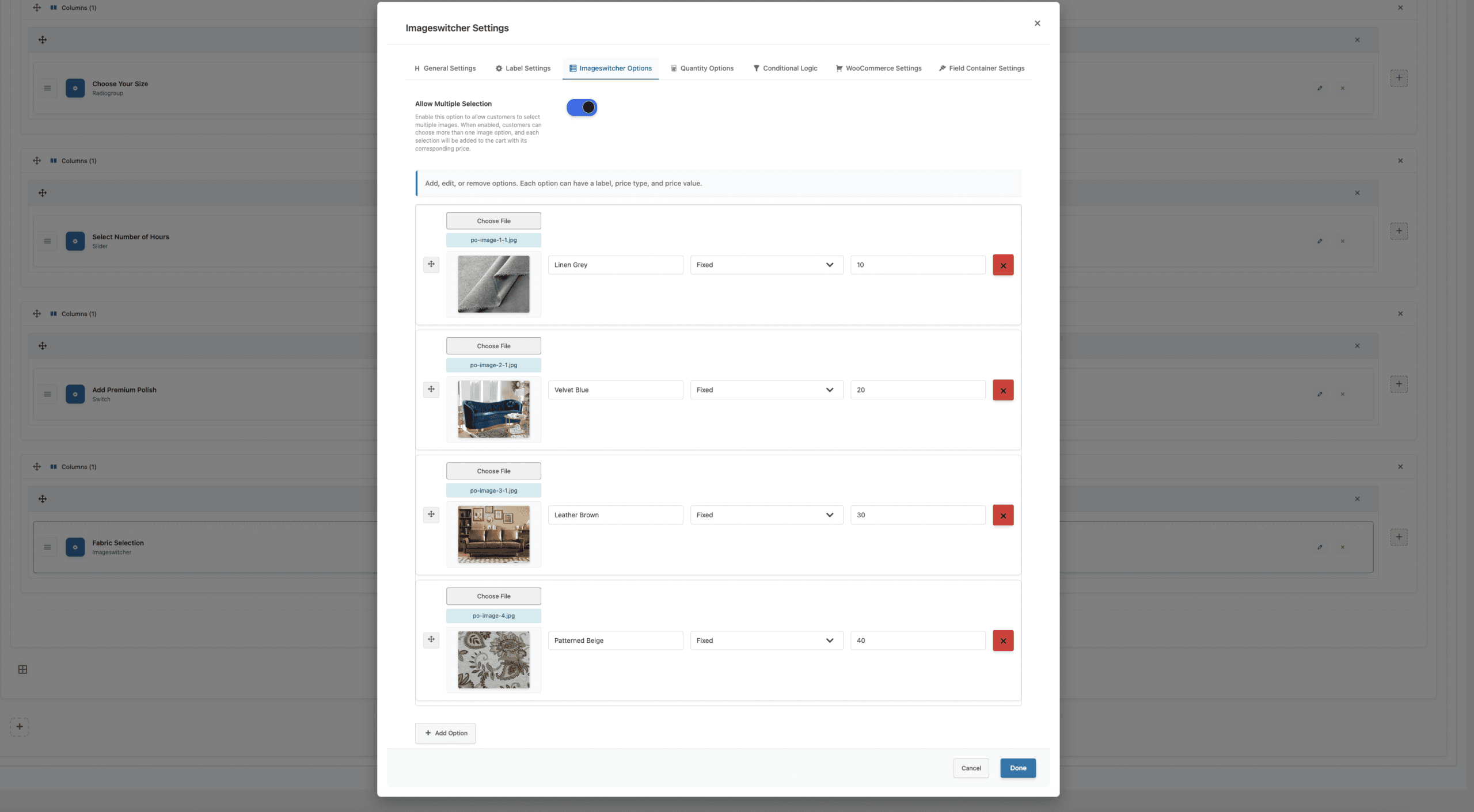 The Image Switcher Field allows customers to select options by clicking on visual image thumbnails instead of text-based choices. Each option displays as a clickable image with a label and price, making it perfect for visual selections like colors, patterns, styles, or any scenario where seeing the option is more important than reading about it. The field can be configured for single selection (like radio buttons) or multiple selections (like checkboxes).
