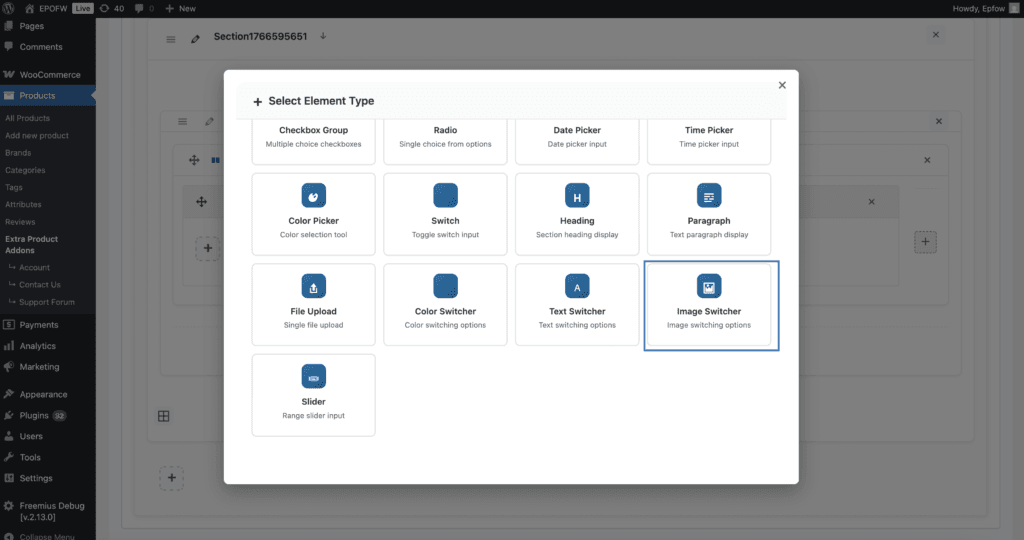 - The Image Switcher Field is available exclusively in the Premium version of Extra Product Options for WooCommerce. This advanced field type is not included in the free version.