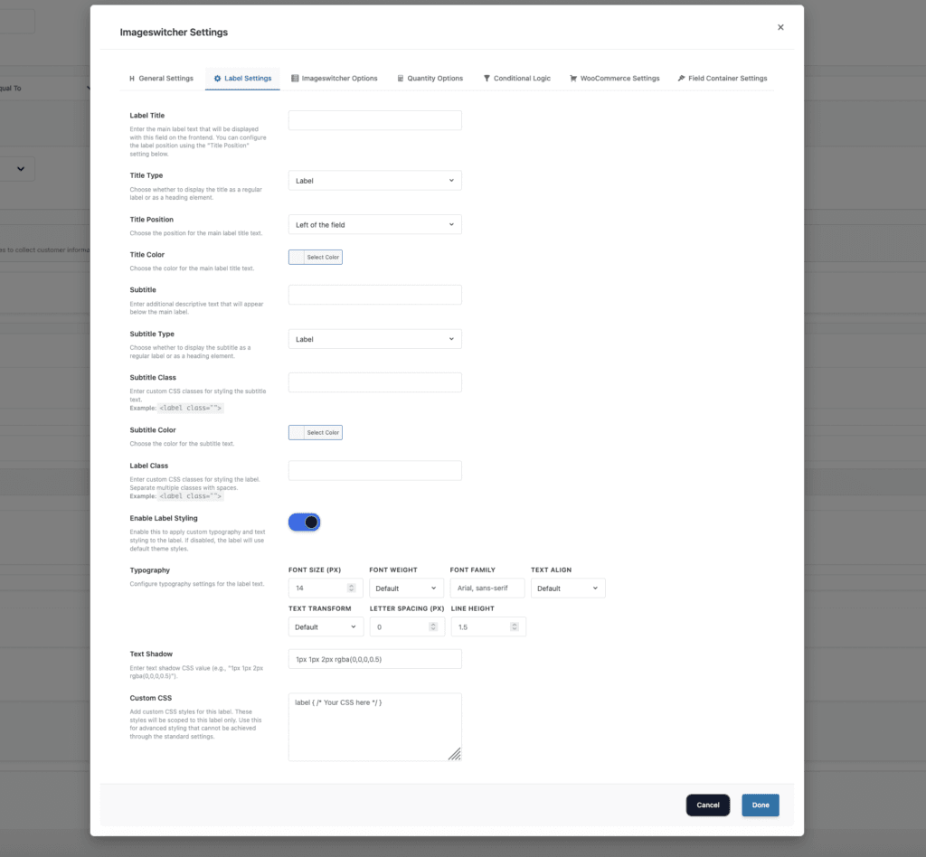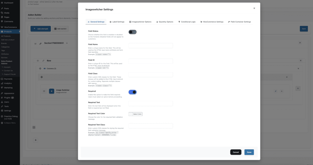 Follow these comprehensive step-by-step instructions to add a Select Field to your WooCommerce products. This guide covers all essential settings organized into General Settings, Label Settings, and Imageswitcher Options.