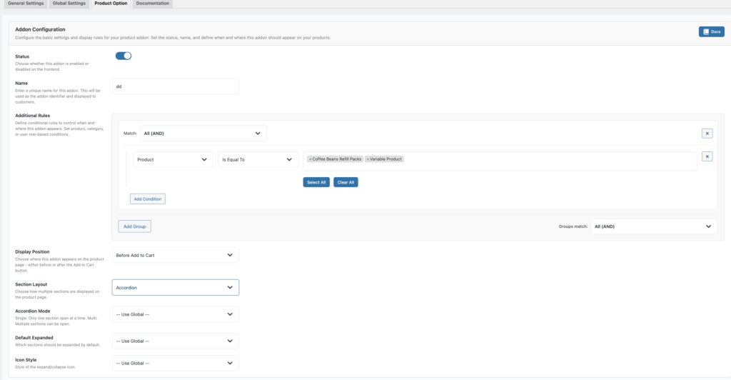 Global Settings give you a clean, scalable way to control addon styling across your WooCommerce store. Use them to define smart defaults, and override only when you need special cases. This keeps your configuration consistent, manageable, and easy to maintain.