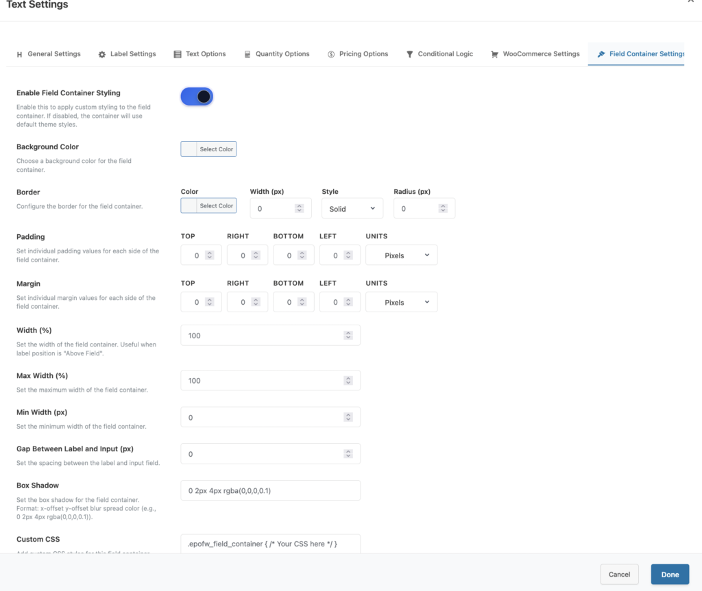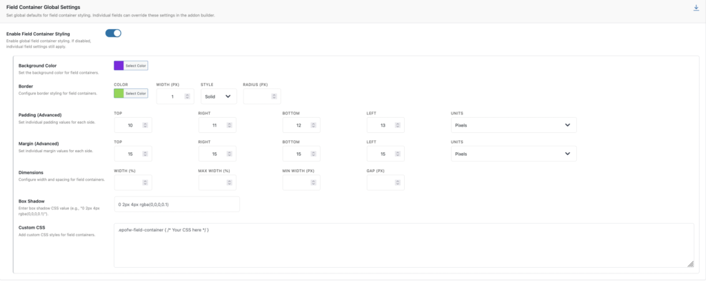 Field Container Global Settings (Padding, Margin, Border, Width)