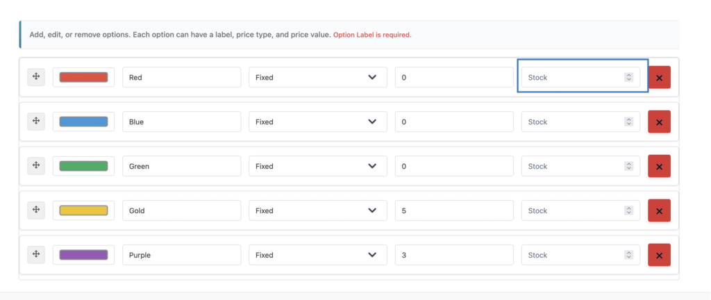 - In the option list, enter a stock value for each option.