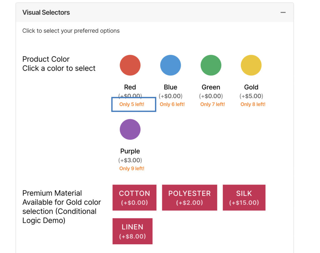 Per-option stock means each option value has its own stock count. If an option is out of stock, customers cannot select it, and the add-to-cart validation blocks it.